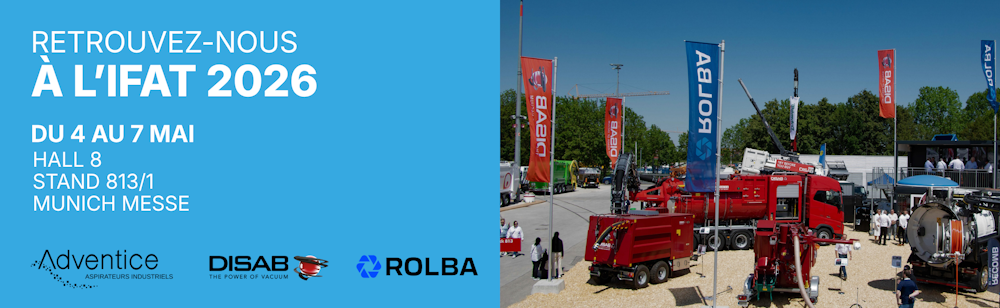 Nous avons le plaisir de vous annoncer qu’Adventice sera présent à l’IFAT 2026, aux côtés de DISAB, du 4 au 7 mai, au Munich Messe, Hall 8 – Stand 813/1, en tant que distributeur officiel de DISAB en France.